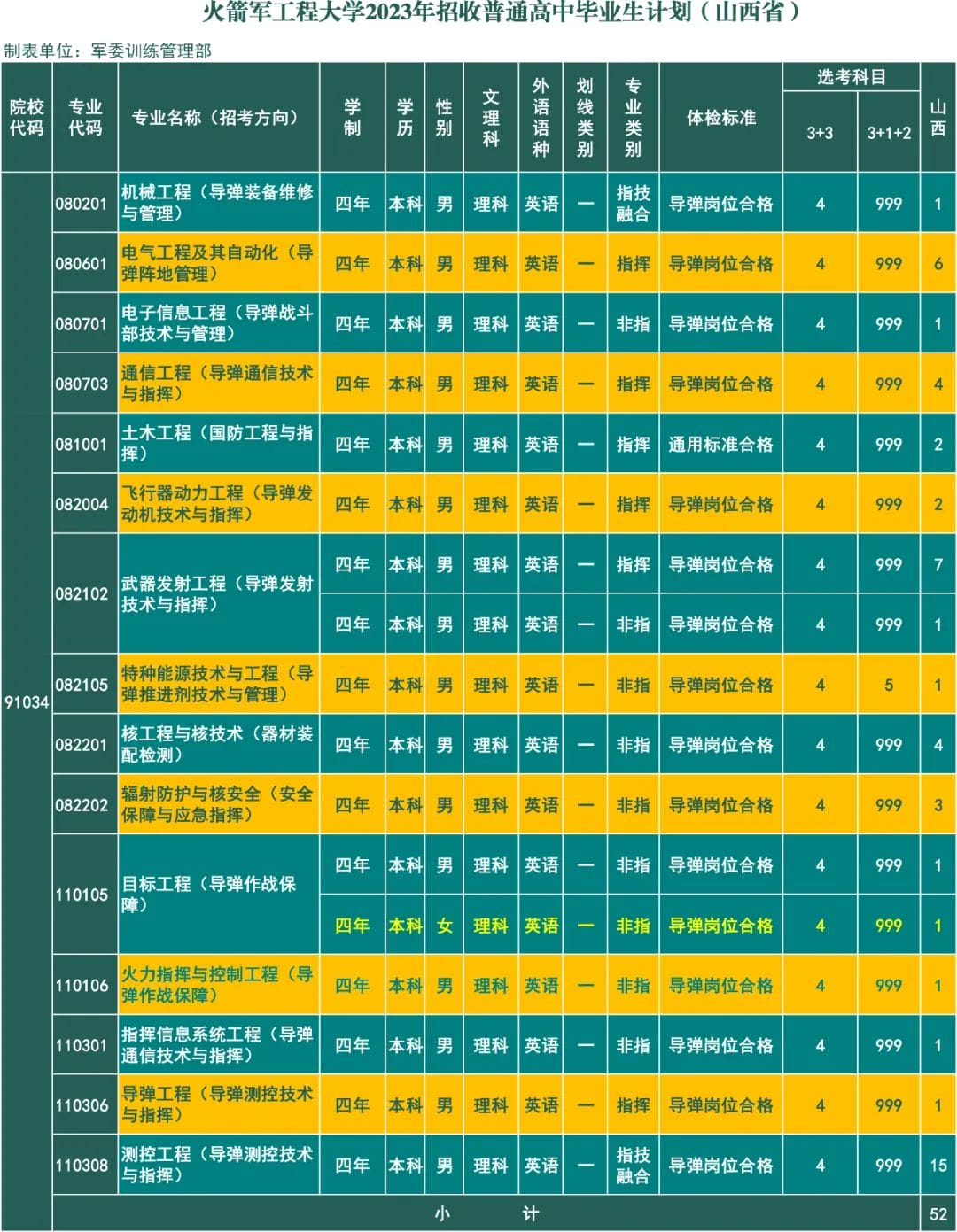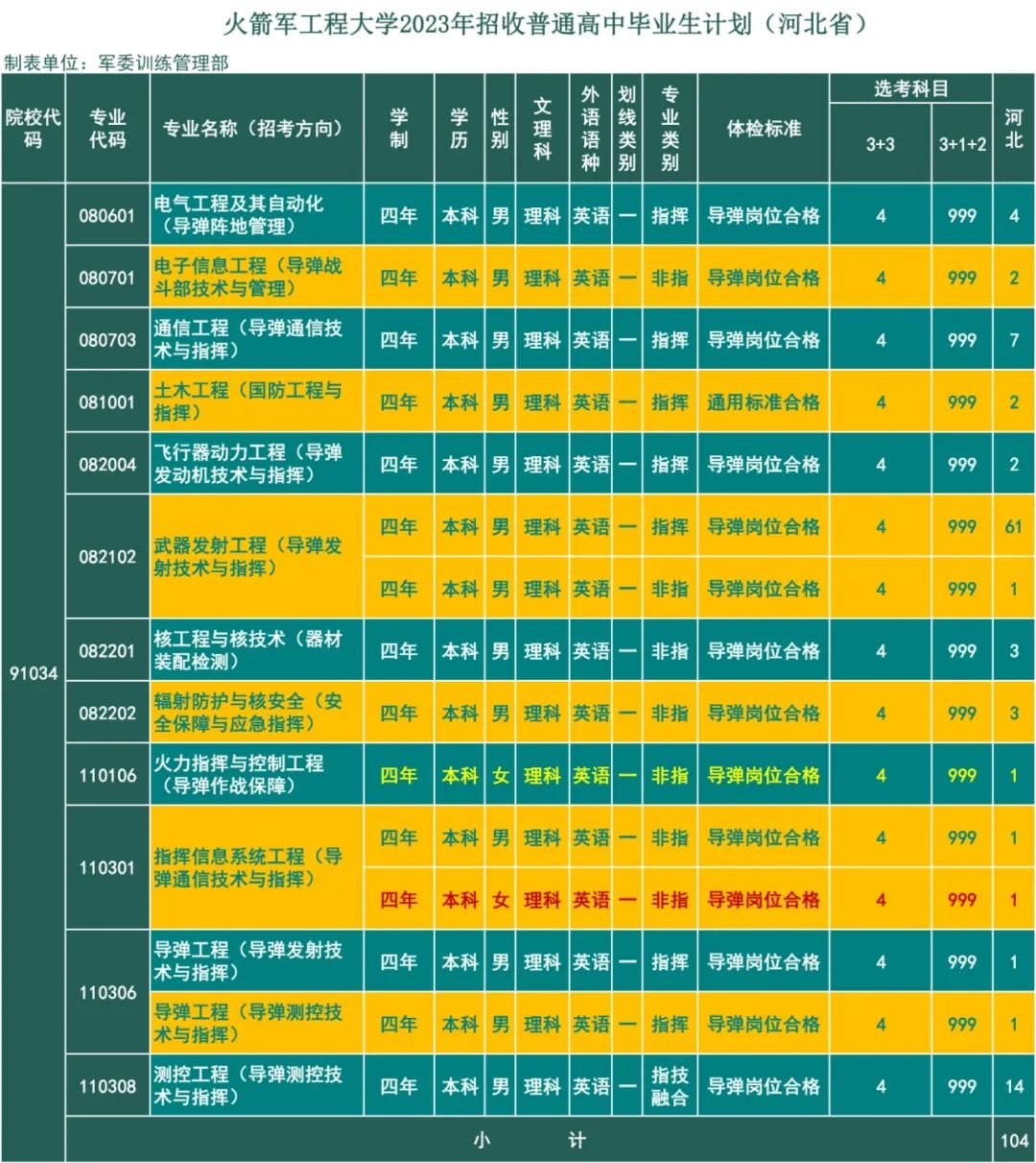 火箭军工程大学2023年普通高中毕业生招收计划(生长干部本科学员)现已公布。火箭军工程大学2023年在全国招收本科青年学员共计1301人,计划在山东、河北、河南等27个省份招生,全部为理科考生。